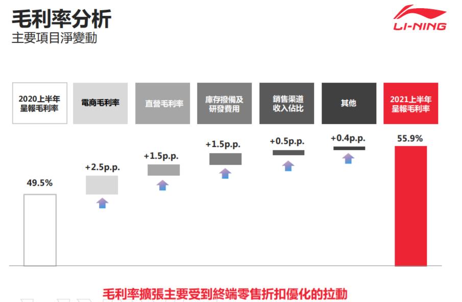几项运营能力的提升,直接促进盈利能力改善。2021年上半年,李宁的毛利率达到55.9%,去年上半年的数据是49.5%,2019年和2020年的毛利率是49.1%。两相对比,上半年李宁财务业绩出奇的好,明眼人一看便不可持续。