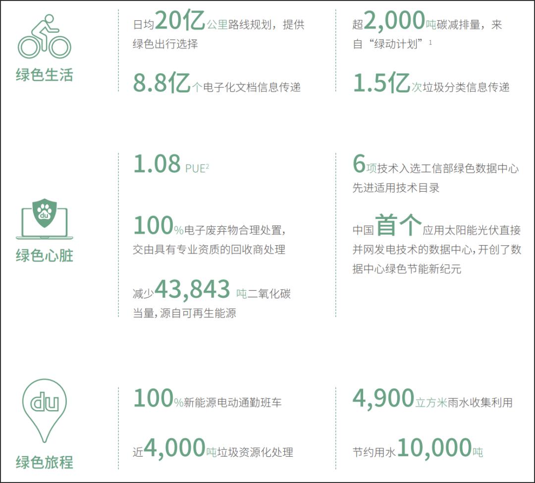 其一,争取自身在2030年实现集团运营层面的碳中和。百度2020年低碳运行亮点包括——倡导绿色生活,选择绿色出行,办公用电子文档等;打造绿色心脏,数据中心PUE为1.08(越接近1说明绿色化程度越高),6项技术入选工信部绿色数据中心先进适用技术目录等;绿色旅程,100%新能源电动通勤班车,近4000吨垃圾资源化处理等。