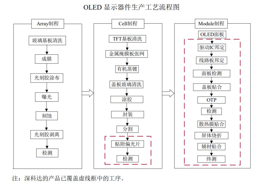 ▲深科达在OLED工艺流程中主要参与的部分(红色虚线框)