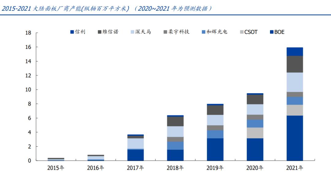 ▲大陆头部屏幕厂商各类OLED产能总合增长趋势,图表来源:国盛证券