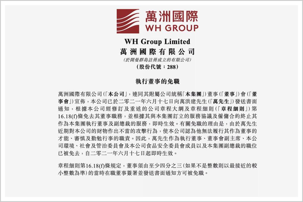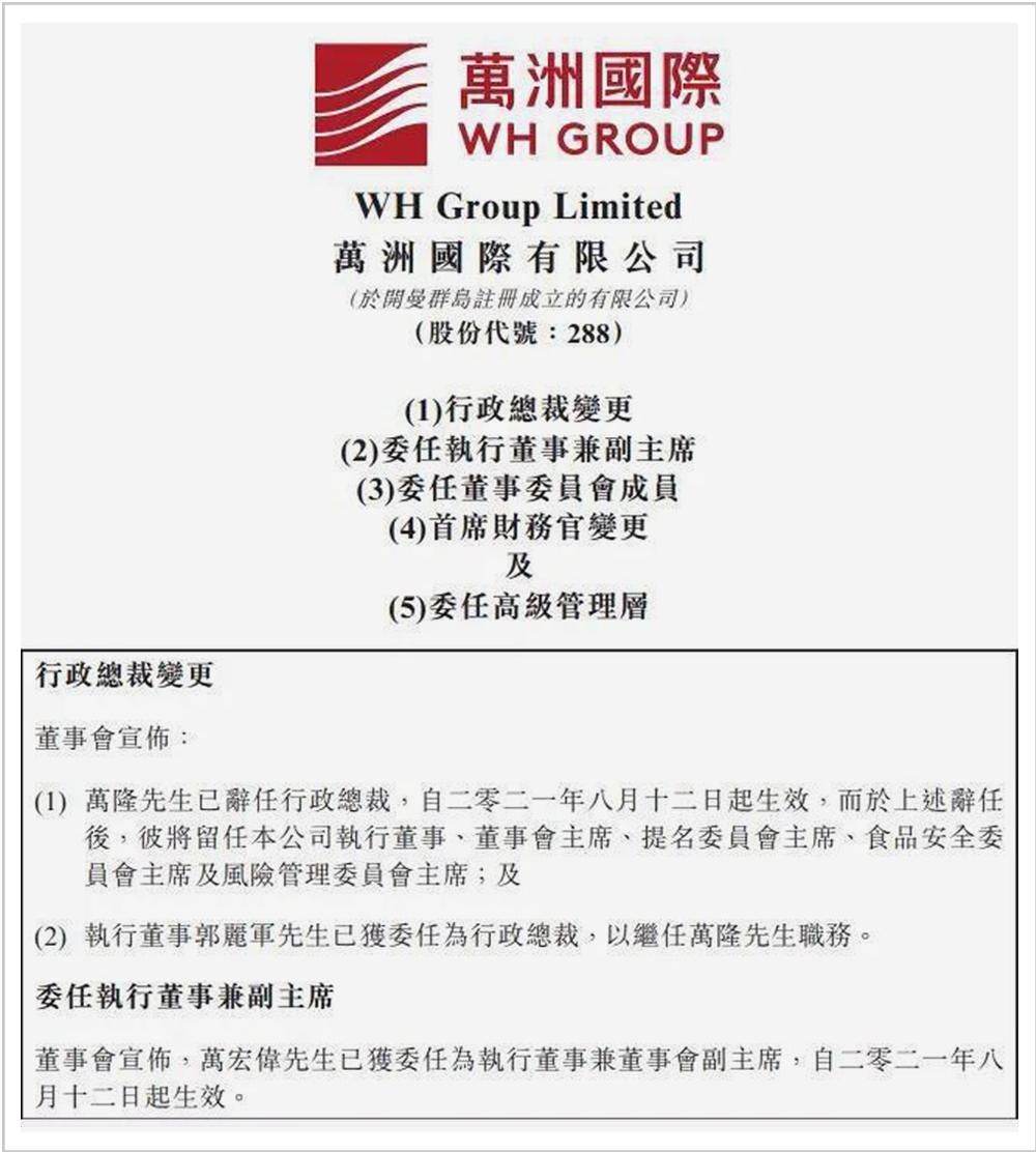 根据8月12日的公告,万隆已辞任万洲国际行政总裁,将留任万洲国际执行董事、董事会主席、提名委员会主席、食品安全委员会主席及风险管理委员会主席;同时委任万隆次子万宏伟为万洲国际执行董事兼董事会副主席,环境、社会及管治委员会以及食品安全委员会的成员。