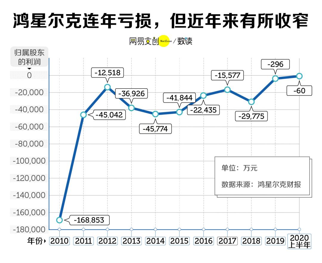 可以看出,最为严重时,鸿星尔克一年亏损了 16.9 亿,但近年来亏损有所收窄,2019 年鸿星尔克亏损 296 万,同比减少了 99%。最新公开的一份财报显示到 2020 年上半年。从归属股东的利润来看,鸿星尔克 2020 年上半年亏损 60 万元。(来源:36氪特邀作者网易数读)