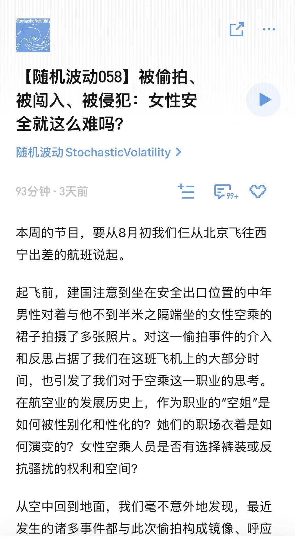 随机波动的这期播客便围绕主播三人亲身经历的飞机上空姐被猥琐男偷拍裙底的事件,结合最近的全季酒店裸身男子闯入女生房间、阿里女员工被灌酒后遭遇领导和客户性侵、吴亦凡事件、东京奥运会上女运动员的着装争议等一系列事件,探讨了女性尤其是职场女性反抗性骚扰的权利和行动空间。