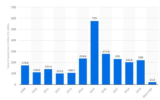 2009年至2020年,美国医疗和生命科学行业并购交易的价值总额超过2.4万亿美元。