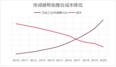 无线工业传感器的占比逐年增加。