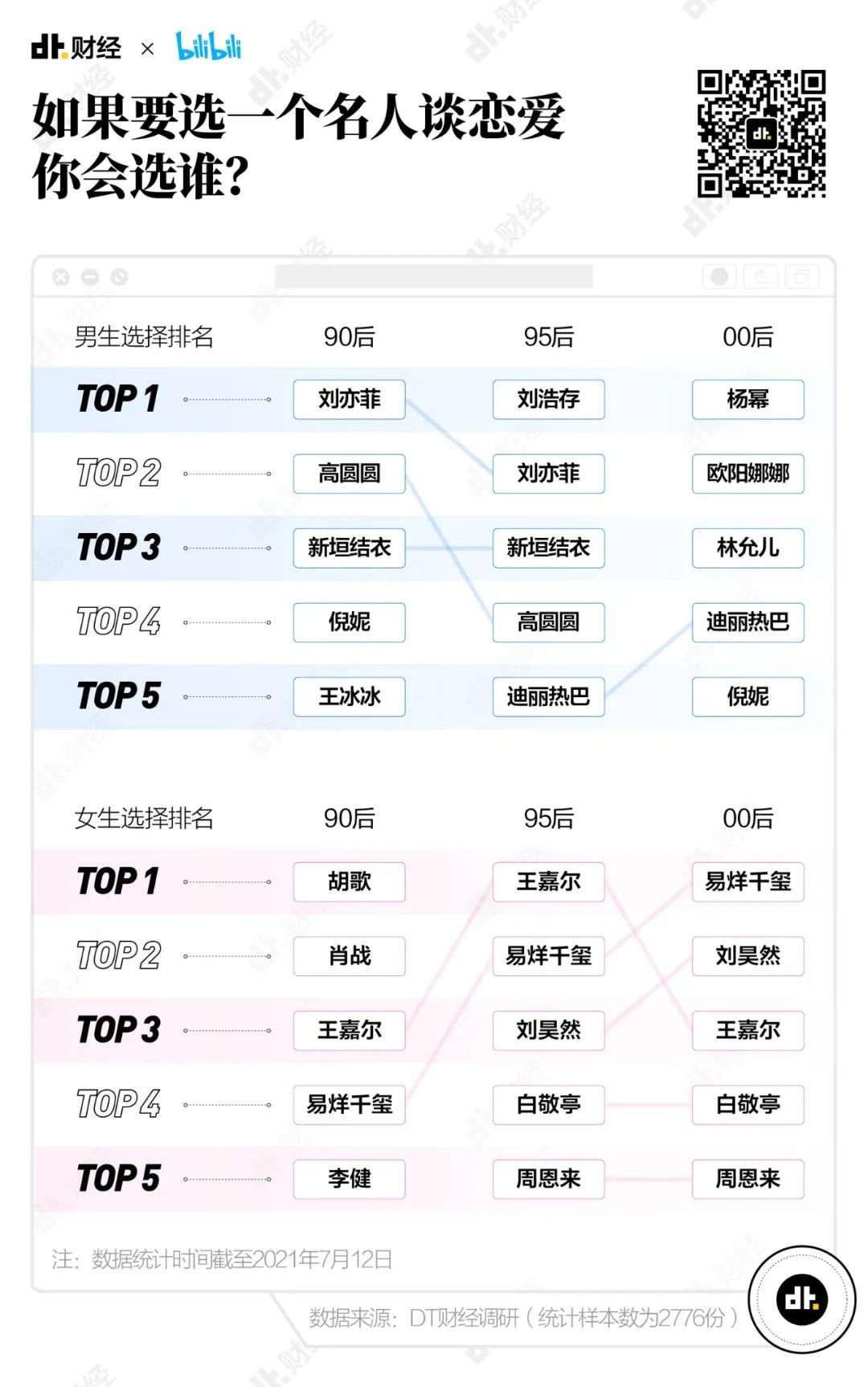 在被问到最想和哪个名人谈恋爱时,高颜值是最大的关键词。男生的审美存在年龄的参差,每代男生都有属于自己时代的女神:90后的梦中情人是刘亦菲、高圆圆和新垣结衣,95后最爱刘浩存,00后最爱杨幂。
