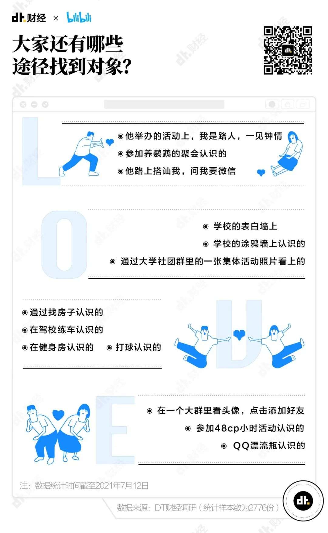 有在学校表白墙、涂鸦墙认识的校园恋情;也有在养鹦鹉的聚会、健身房、驾校、甚至大马路上偶遇的;还有一些看起来不太靠谱,却意外成功的——比如在一个微信大群里看头像,看哪个有眼缘就加哪个;又或是通过“古早时期”的QQ漂流瓶,不可思议中又带着一丝命中注定的浪漫色彩。