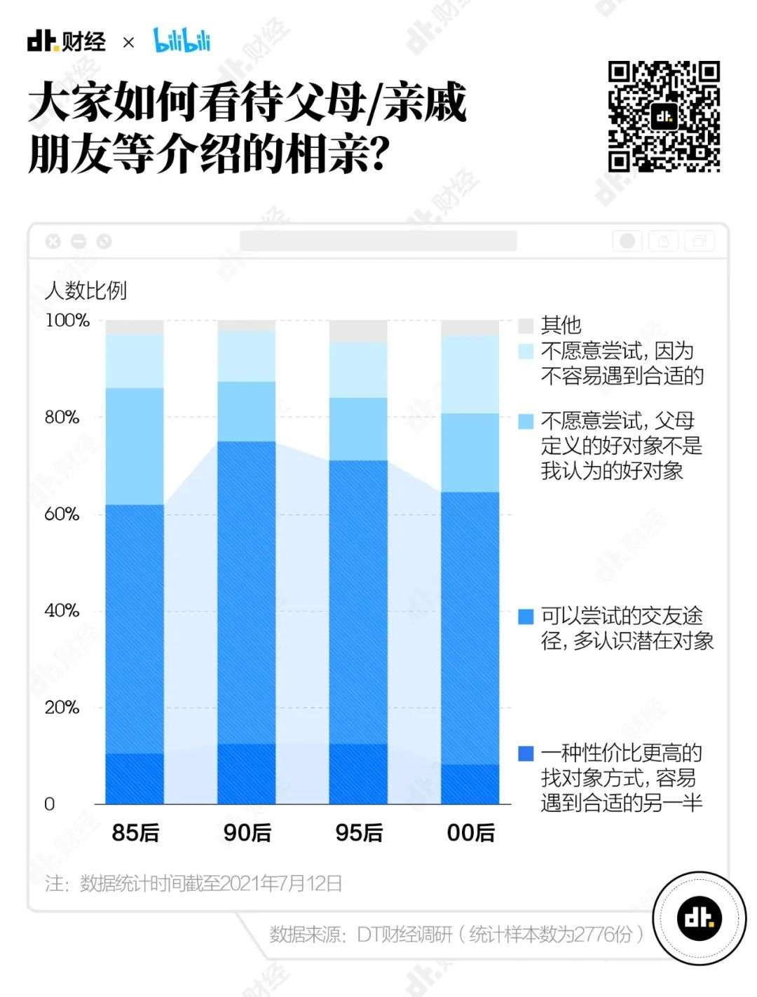 90后和95后对相亲的接受度最高,有超过7成的人认可或者愿意尝试相亲。