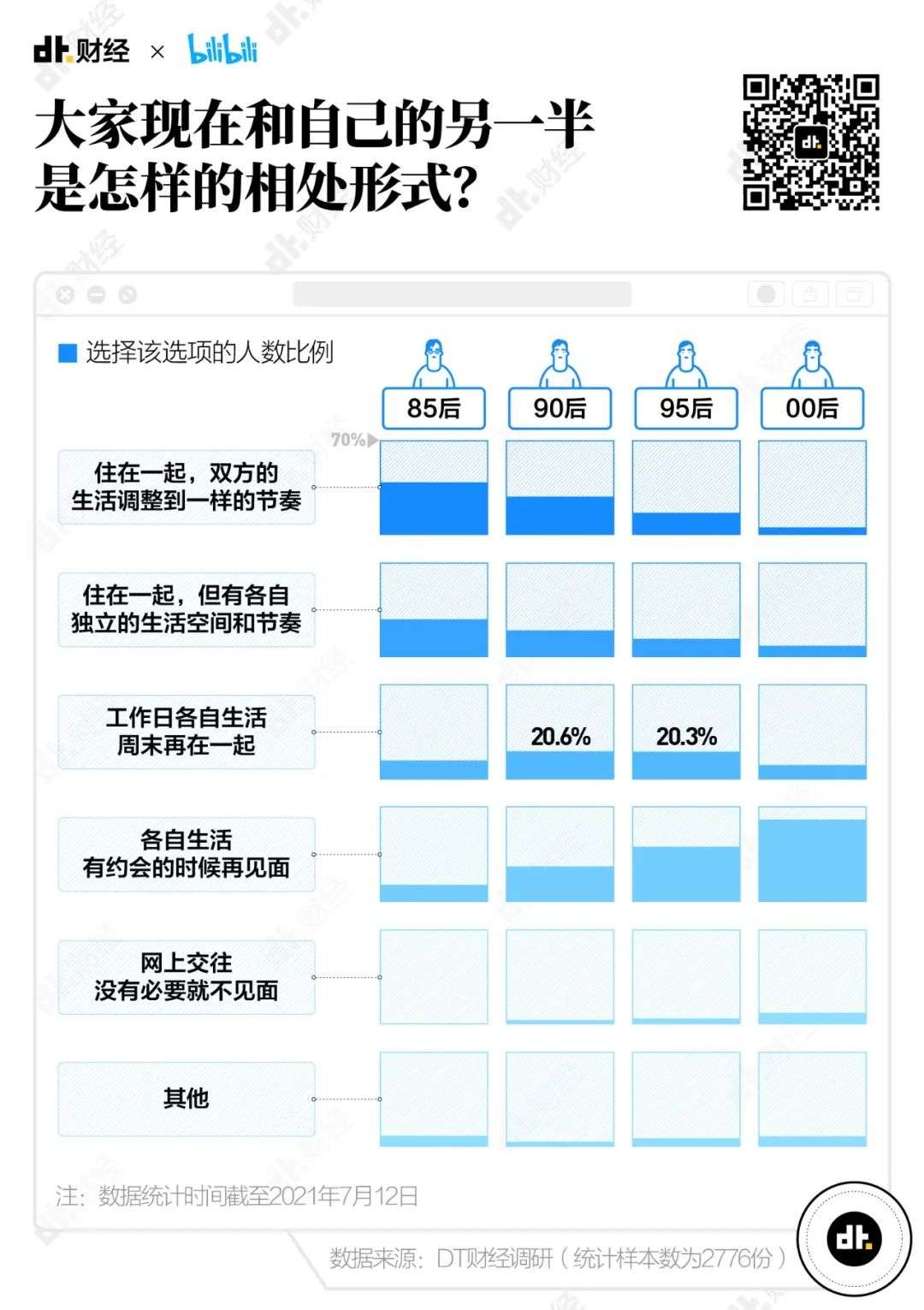 从85后到00后,越年轻的情侣,住在一起的比例就越低。00后可能是因为还没进入社会,客观条件不允许住在一起。4成的95后情侣各自生活,有约会的时候再见面。