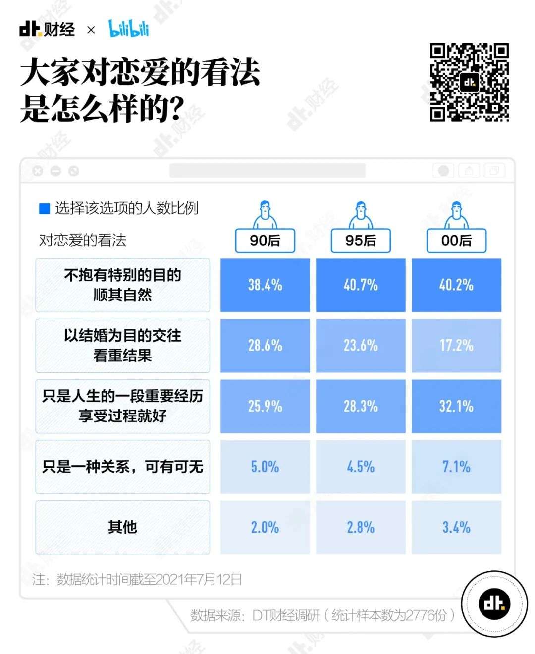不管是90后、95后还是00后,大部分都对恋爱“不抱有别的目的,顺其自然”,或者认为“只是人生的一段重要经历,享受过程就好”。