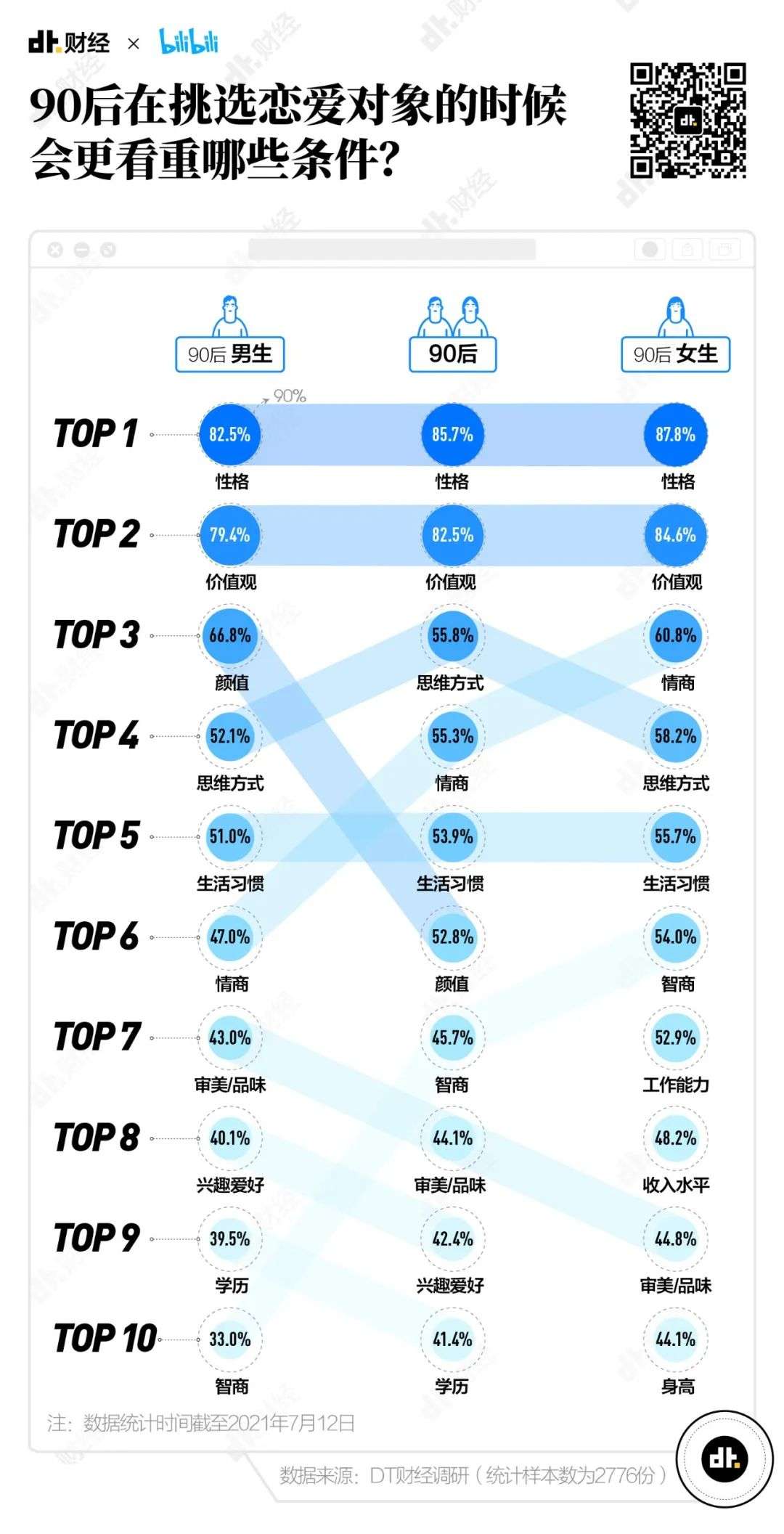 分开来看,90后男生和女生又不同。在性格和价值观之外,男生最看重颜值(66.8%)。《90婚介所》节目中就有男生直言,颜值关系到后代的长相。女生则更在意情商(60.8%)。