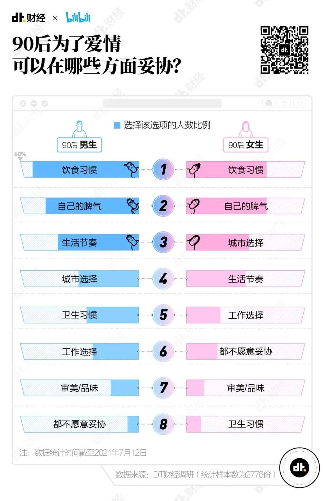 饮食习惯是90后最愿意为了爱情妥协的方面,其次则是自己的脾气和生活节奏。