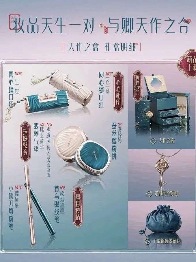 今年七夕,花西子再次推出了礼盒。这份售价999元的礼盒包含两支同心锁口红,一个气垫、一个蜜粉饼,一直眉笔和一支眼线笔。还有一个盒子(据说可以做首饰盒)、一个“同心锁项链”(有点像Tiffany Keys系列的国风版?),甚至还有一个荷包。