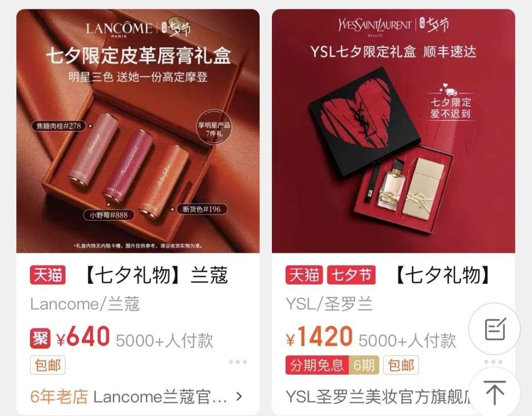 直男没买970元的兰蔻礼盒,而选择了799元的完美日记或者999元的花西子礼盒。这反映出花西子和完美日记在投放上十分精准,在欧美大牌中杀出了一条血路。在京东美妆的七夕礼盒中,完美日记的口红礼盒(799元,包含6支口红和一份永生花)在国货品牌中排名第一。花西子售价999的礼盒排名第12。抖音、京东直播和一些小区电梯广告里,花西子在全力出击……