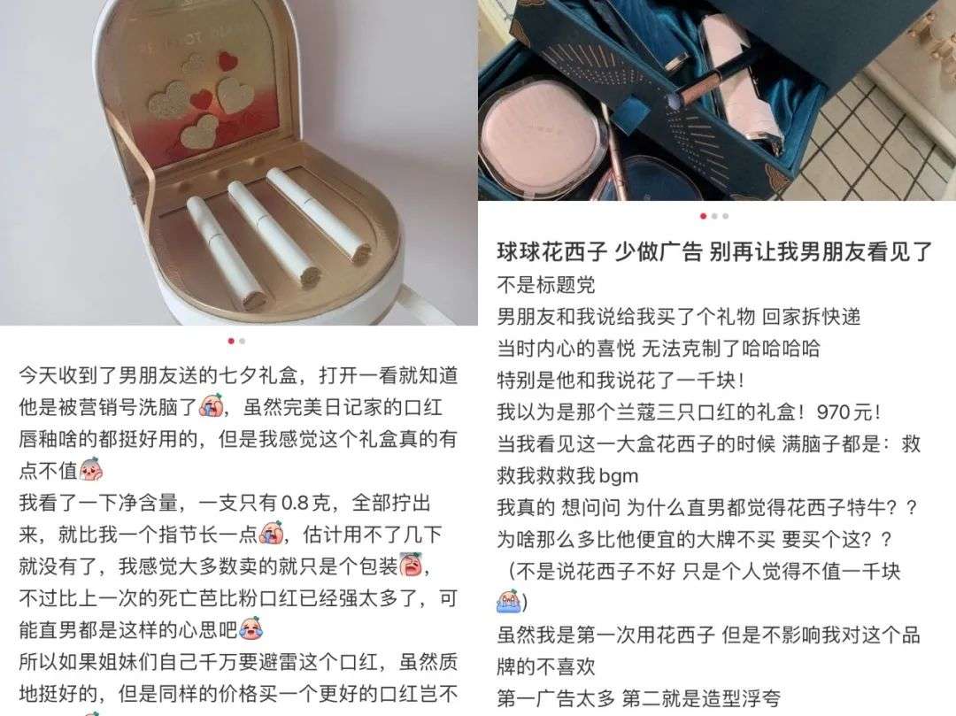 “现在不是已经不是女孩子的钱好赚了,男孩子的钱也好赚。世上直男千千万,买花西子的占一半。我爱我的男朋友,但是我不爱花西子了,告辞。”一名小红书用户在520刚收到花西子礼盒时,写下了这一点吐槽。