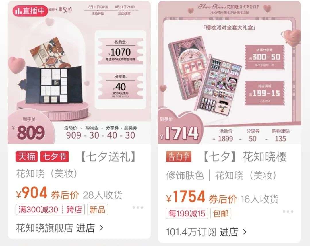 近两年,在各大情人节(2月14日、5月20日、七夕节和圣诞节),几乎所有的国货品牌都开始推出套装,包括花知晓、intoyou和酵色等。它们卖的礼盒有200多的小礼盒,也有超过1700元的大礼盒。有些是给消费者自用的,有些是礼赠场景。