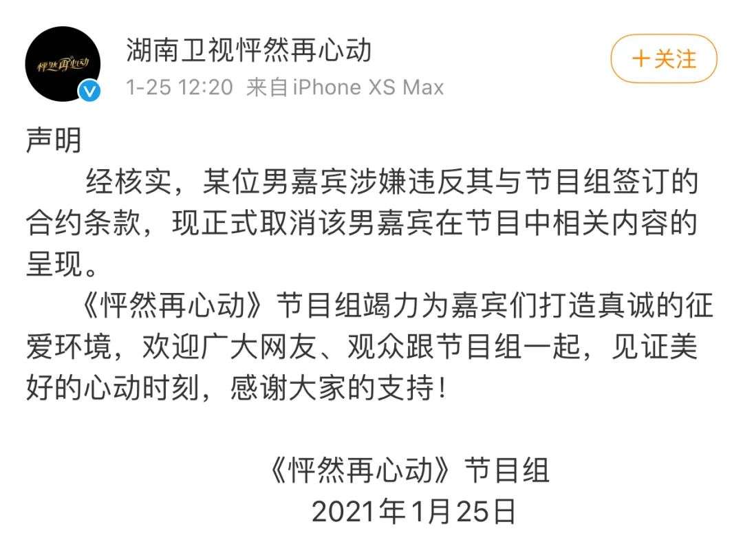 在《怦然再心动》中,第一期黄奕的约会对象陆佳颖在节目播出之后被曝出“脚踏N条船、骗婚gay”等问题,而后节目组官博发布声明,核实其涉嫌违反与节目组的合约条款,并正式取消该男嘉宾在节目中相关内容的呈现。