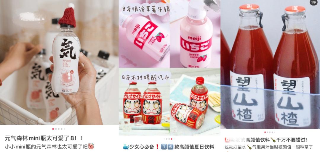 小红书上分享“高颜值饮品”的相关笔记超过9万篇,笔记中不乏“就是冲着神仙颜值入手的”“仙女就是要喝好看又好喝的饮料呀”等描述,甚至有博主表示,“颜值这么高,喝完瓶子都不舍得丢掉”。