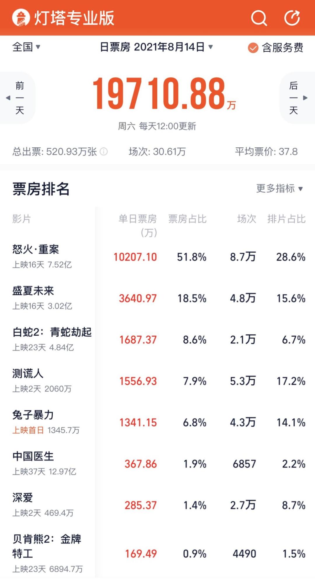 其中, 排在第一的《怒火·重案》已经连续16天获得单日票房冠军, 目前票房已经突破7亿。七夕当天以超过1/5的单日最高排片比,获得超过1亿的票房,仅这一部影片的大盘占比就超过了一半。这也从侧面说明,即便是老片,但只要体量足够大,对于稳固大盘仍有重要的作用。