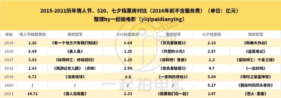 另外,尽管七夕档有一定的爱情元素加成,但是这个档期相比其他的爱情片档期,比如214情人节档期,以及520档期来说,同样有其自身的特点。