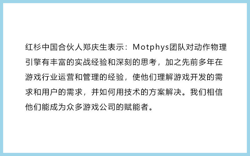 据Motphys介绍,其动作物理引擎的性能和开发效率已经被业内多家知名工作室认可,并已与业内数家游戏公司达成技术服务合作,目前累计服务的游戏玩家数量过亿。未来,Motphys还将与合作伙伴共同打造数款标杆游戏产品,其中还将包括AAA大作。