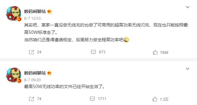 根据数码博主@数码闲聊站表示,这个文件已经开始生效,当然那些在文件生效之前量产的机型不会受到影响,不过之后所有机型都不能搭载高于50W的无线充电技术。小雷虽然一开始不能理解,但已成定局,手机厂商和市场又会作出什么样的反应?。