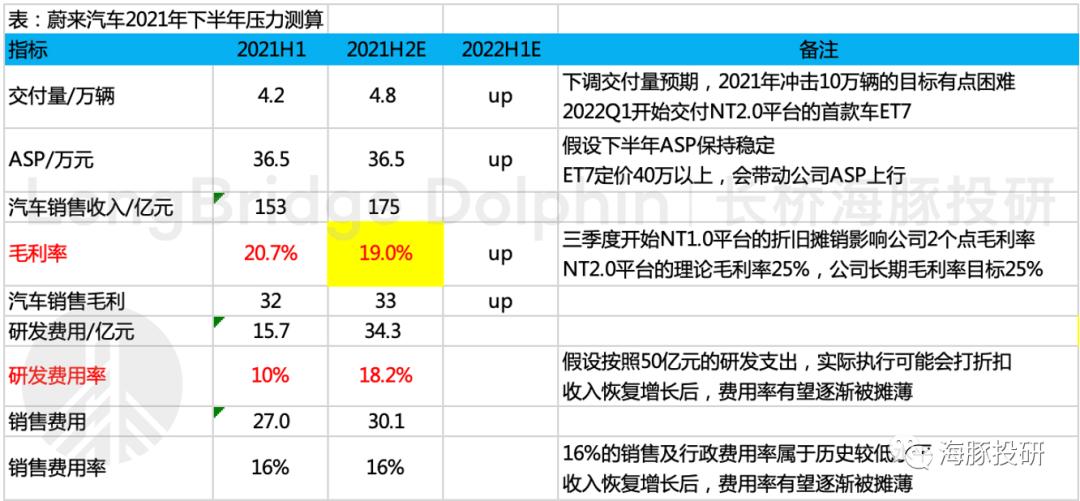 所以按照电话会的意思,海豚君认为, 蔚来的车辆销售毛利率在2021年下半年可能下降为19%左右,2022年一季度ET7开始交付后,毛利率有望回升 ,并且随着NT2.0平台车型的不断丰富,公司车辆毛利率会高出20%,逐步去向公司追求的25%的目标靠拢。