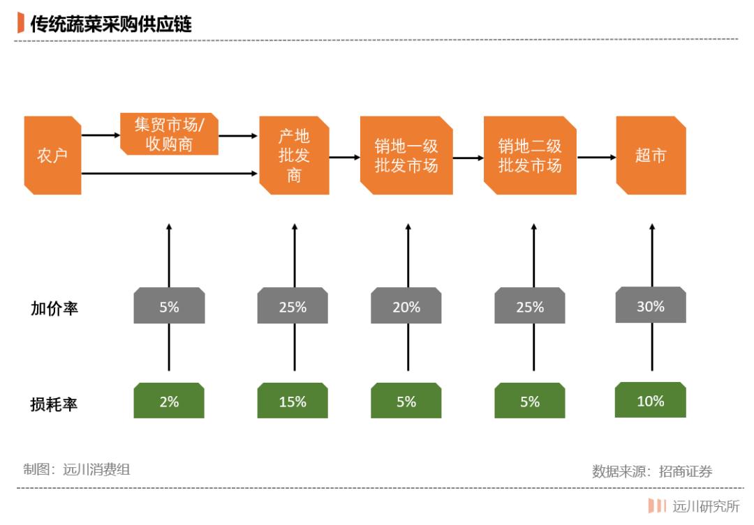 利润还是要从供应链中抠出来。其实无论是超市还是农贸市场,其背后都是一套由菜篮子工程奠定的生鲜供应链体系:农户-合作社/基地-一级批发商-农产品批发市场-二级批发商-零售端-消费者。