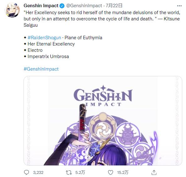 仅在《原神》的英文官方推特上,一张在之后的2.1版本才能抽到的雷电将军巴尔立绘就获得了欧美玩家15.2万点赞和5.2万转发,3000多条评论里的欧美玩家纷纷表示“shut up and take my money”。