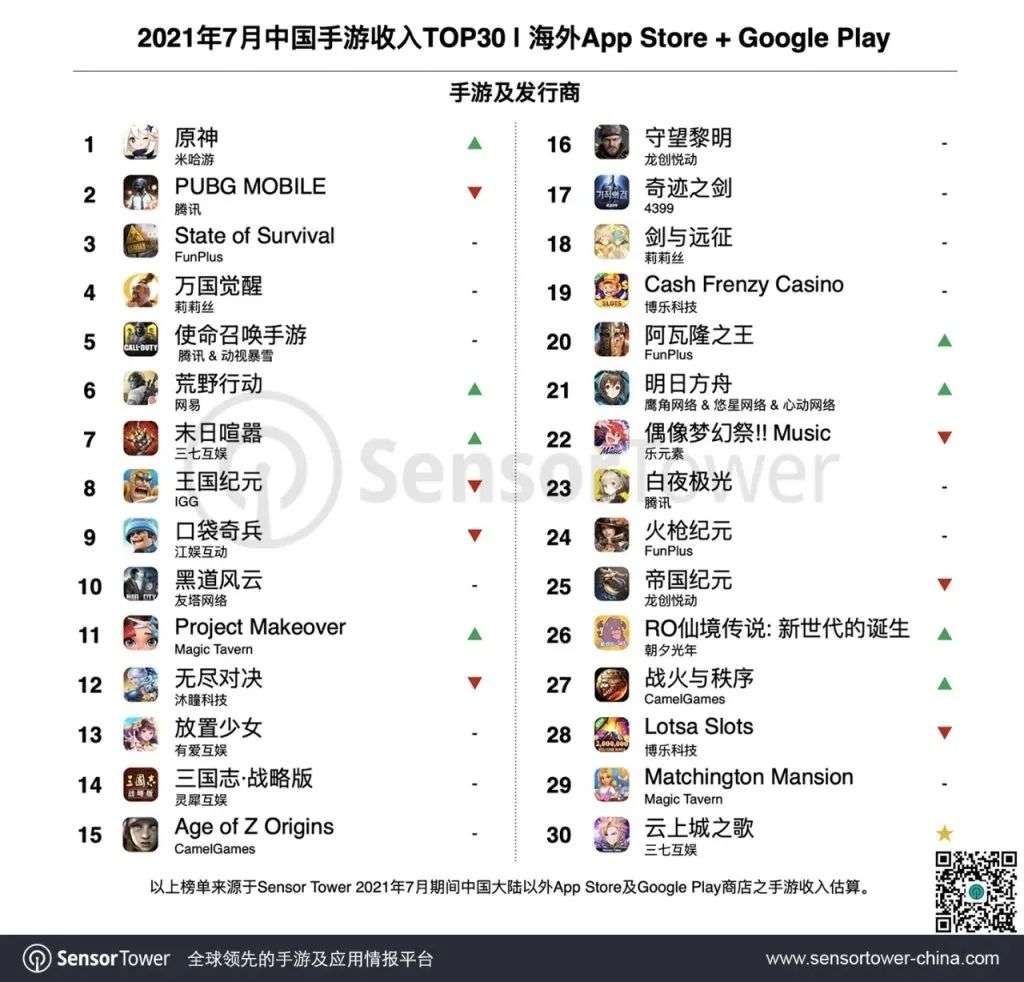 7款泛二次元游戏海外集中爆发,《原神》超越了《赛马娘》——7月手游出海Top30