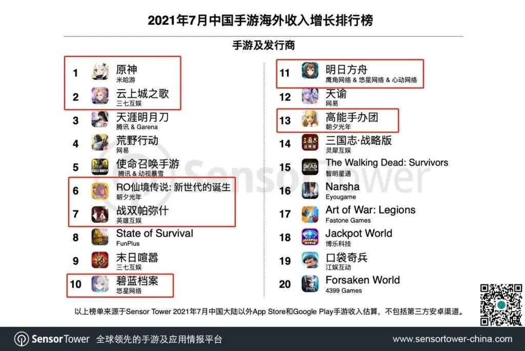 7月国内手游出海最大的亮点在于,国内泛二次元游戏在米哈游、腾讯、三七等越来越多厂商加入的情况下,阵容越来越强,新游成绩优异,老游依然给力。