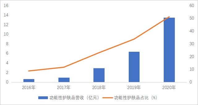 2020年,公司功能性护肤板块实现持续高速扩张,2020年功能性护肤品营收达到13.5亿元,占总营收的比例为51%,5年复合增速高达83%。