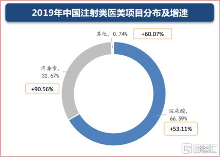 首先,根据弗若斯特沙利文数据显示,2015-2019年医美注射类终端市场规模的年复合增长率为24.4%。其中,玻尿酸注射类医美项目占比66.59%,肉毒素占比32.67%。