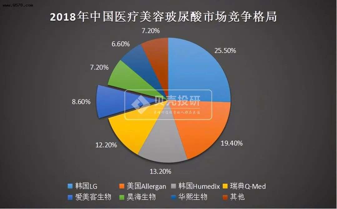 最大的问题就是,到目前,国内玻尿酸市场,仍由进口品牌唱主角,韩国LG市场份额占比25%,美国艾尔建占19.4%,韩国占.2%,瑞典Q-Med占12.2%。仅仅四家份额,已近70%。