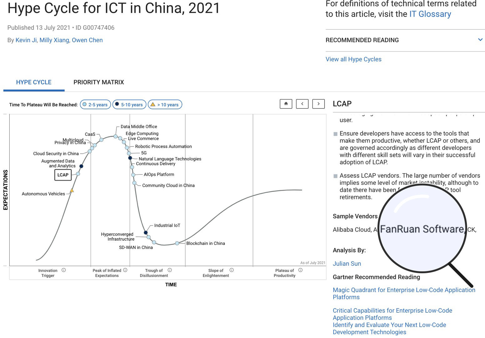 近日,全球权威的技术研究和分析公司Gartner发布《2021年中国ICT技术成熟度曲线报告》。低代码应用开发平台(LCAP)作为新兴技术热点首次被纳入。帆软旗下产品简道云凭借自身完善易用的产品功能、轻量级的交付体系与公民开发下的广泛采用,入选LCAP Sample Vendor(代表厂商),也是国内唯一一家入选的零代码厂商。
