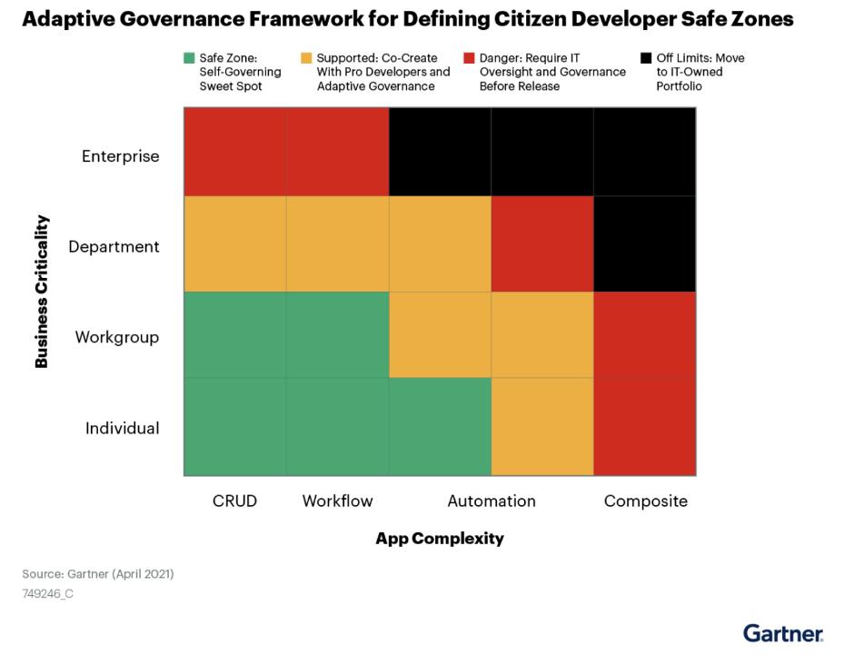 针对企业内部不同的应用复杂性与业务作用范围,Gartner定义了公民开发者安全区的自适应治理框架,用以指导企业内部协作模式。对于个人和工作组级别的简单的工作流,可以业务人员为主导进行社区自治。而对于部门、公司级别,或者更复杂的开发用例,则需要IT介入与治理,共同完善应用程序的开发与交付过程。
