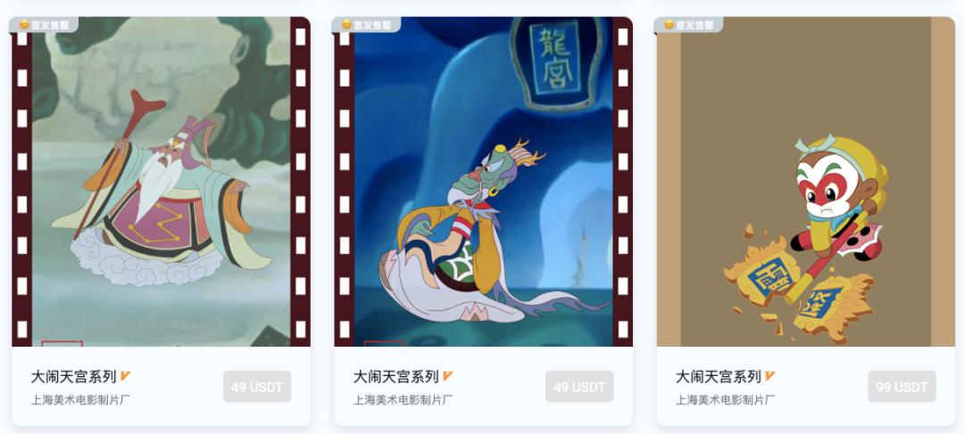 由于NFT具备天然的收藏属性和便于交易,加密艺术家们可以利用NFT创造出独一无二的数字艺术品。比如,NFT 可以代表一幅画,一首歌,一项专利,一段影片,一张照片,或者其他的知识产权。比如上海美术电影制片厂就铸造了「大闹天宫系列」的NFT作品,价值49美元、99美元、149美元不等,目前均已售罄。