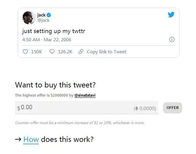 3月6日,推特CEO Jack Dorsey发布了一个指向平台“Valuables”的链接,页面打开后,是他于2006年发布的首条推文“just setting up my twttr”(刚设置好我的推特)正在上面拍卖,最高出价250万美元。