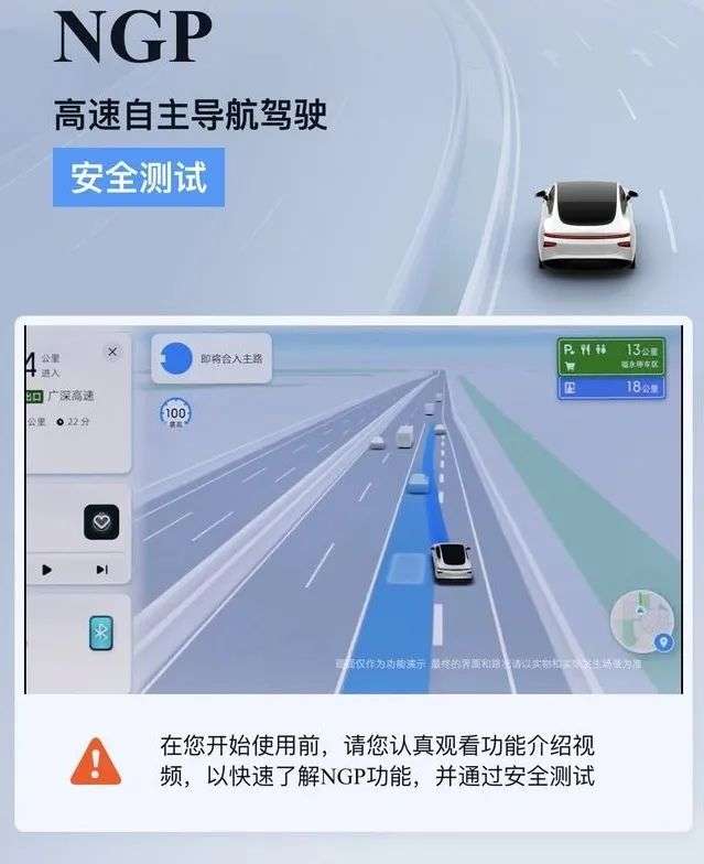 小鹏汽车P7在激活小鹏类似功能NGP权限时,也需要观看四分钟左右的NGP安全驾驶提示,用户必须完全看完,然后正确回答问题,“考试”通过后,NGP功能被开启。