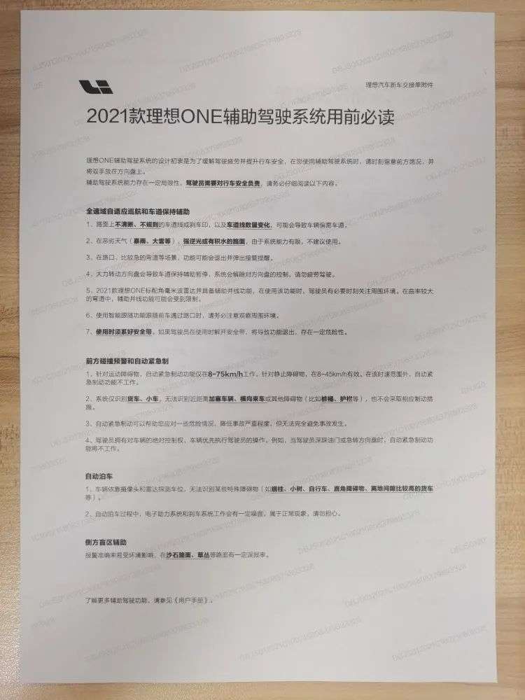 在交付新车时,理想还附带了一份纸质版的辅助驾驶系统用前必读。