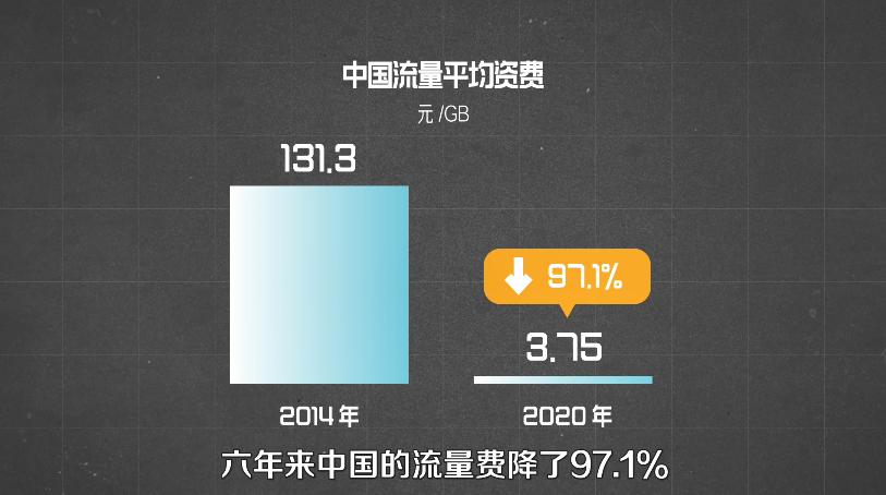 现今中国通信,不仅快,还便宜。 过去10年,几乎所有行业都在涨价,唯独流量费在不停地降。2014年,中国流量平均资费是131.3元/GB,而到2020年降到了3.75元/GB。计算下来,六年来中国的流量费降了97.1%。