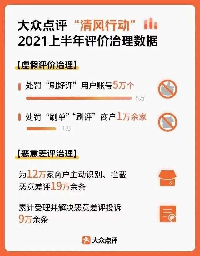 所以,2019 年 4 月,大众点评正式启动了平台治理专项 「清风行动」。2021 上半年,大众点评针对刷单、刷评等问题,处罚商户 1 万多家,处罚用户账号 5 万个。