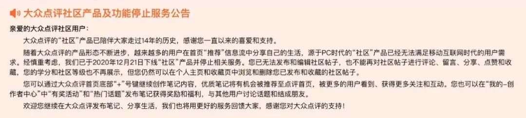 2020 年 12 月 21 日,大众点评下线持续了 14 年的「社区」产品并停止相关服务,理由是「越来越多的用户在首页推荐信息流中分享自己的生活,源于 PC 时代的社区产品已经无法满足移动互联网时代的用户需求」。