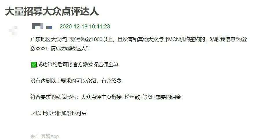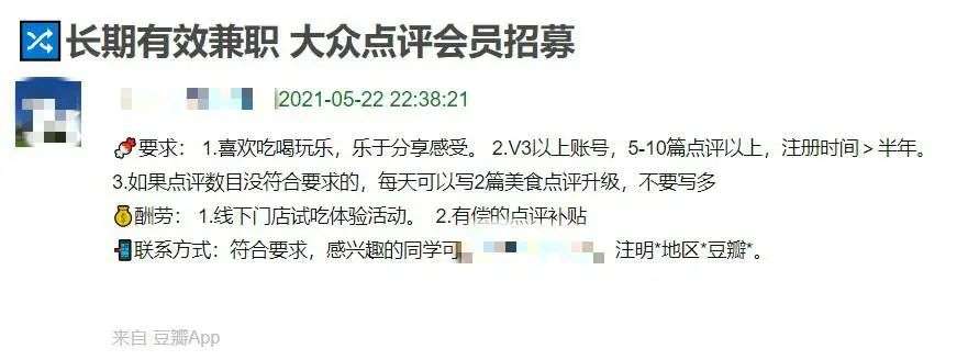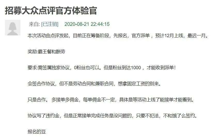 大众平台在主动或者被动地打击老用户的同时,也被传出说要扶持官方团队,网上流传着一些招募官方体验官和点评达人的帖子。