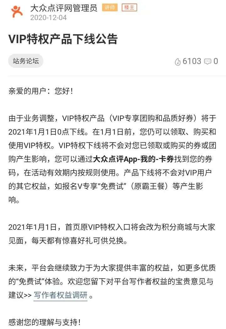 2020 下半年,大众点评一再改版。2020 年 8 月 3 日,大众点评关闭了贡献值显示,且静态等级变为动态升降;2021 年 1 月 1 日,大众点评正式取消橙 V 的两项特权(VIP 专享团购和品质好券)。