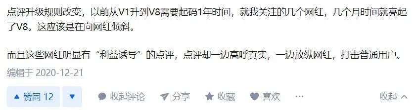 但随着橙 V 等级制的发展,等级越高的用户有了越大的声量,当他们被第三方组织起来引爆一家商铺时,就足以盖过其他噪音。而且不比从前认真写评论,现在的流量很容易通过营销手段打造,就像以前的明星靠作品,现在的流量明星靠包装。