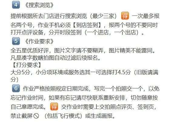 事实上,就算是麦当劳、全聚德这类特别成熟和正规的餐饮店,同样有维持每月评论量的需求。V8 用户肥猫曾进入过麦当劳的微信群,被代称为「作业」的评论要求十分繁琐。在收益方面,一条 V7 评论 70 元,一条 V5 评论 50 元。