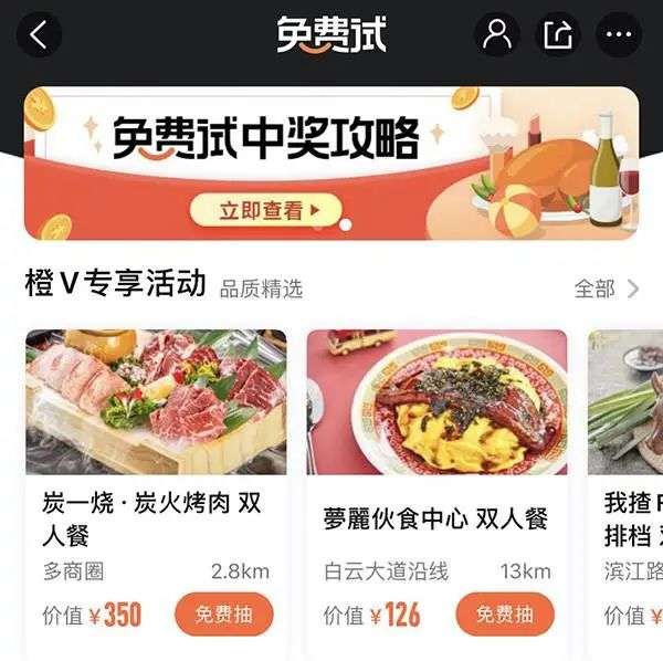橙 V 的权益有很多,「霸王餐」(现改名「免费试」)抽奖资格可能是最重要的一项。