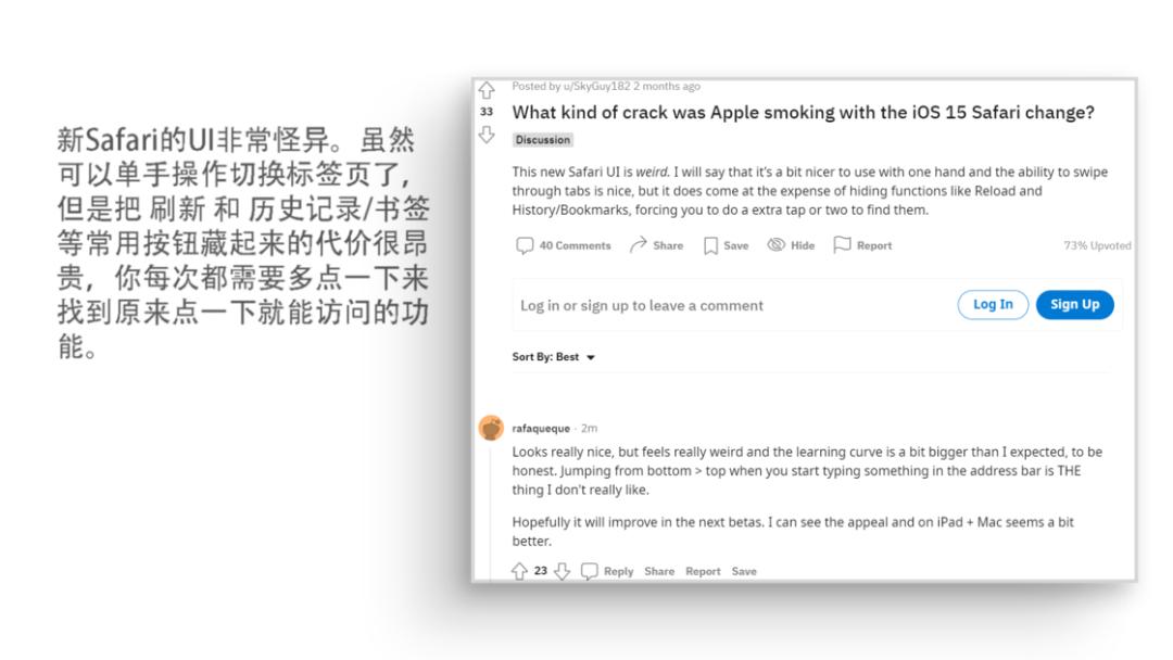 我没准备开始吐槽 Apple 清奇的设计思路,Reddit 上的 #iOS 15 Safari 标签下已经聚集了许多不满的声音。