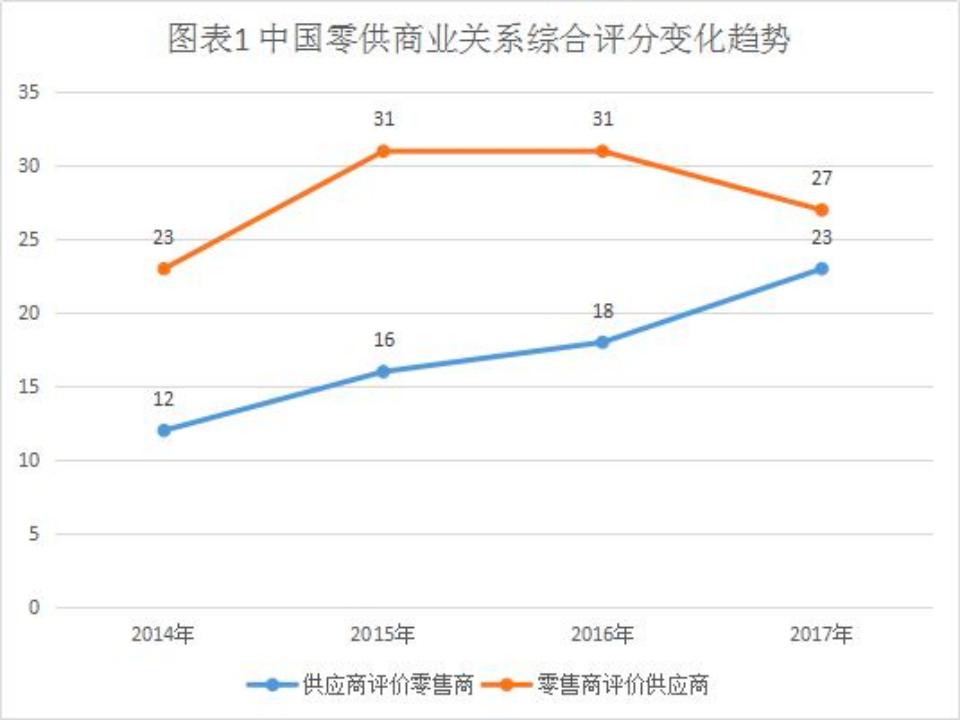 根据《2017年度中国零供商业关系研究报告》(CCFA),2014年至2017年,供应商对零售商的评价绝对值依旧较低,但双方评价的综合满意度分数整体趋好,零供关系有所缓和。